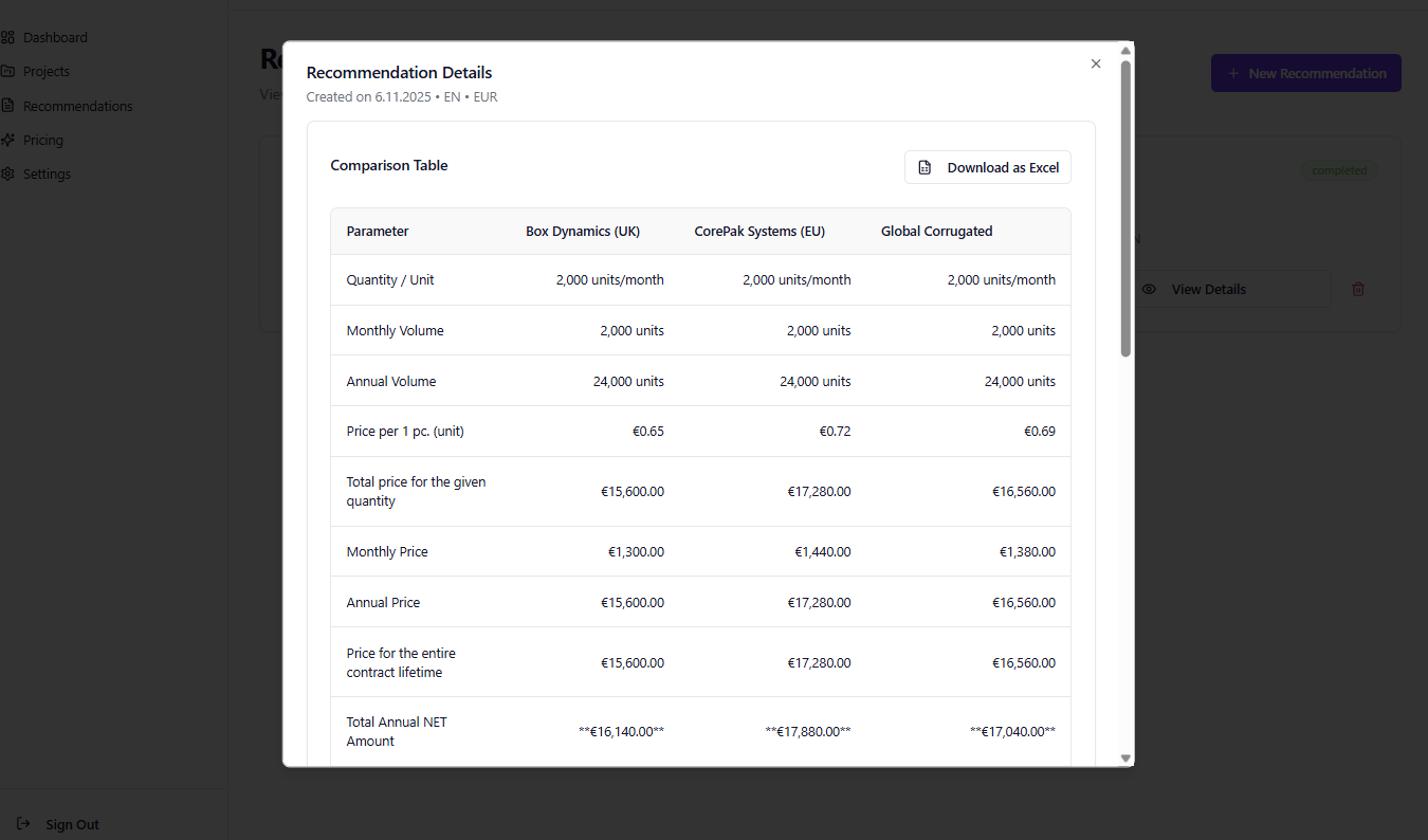 Spreadsheets only store data – Savvily analyzes it. The AI reviews supplier offers, detects risks, and recommends the best options instantly. You also get a ready-to-download Excel table with all results, so you can easily use them in your existing tools.
